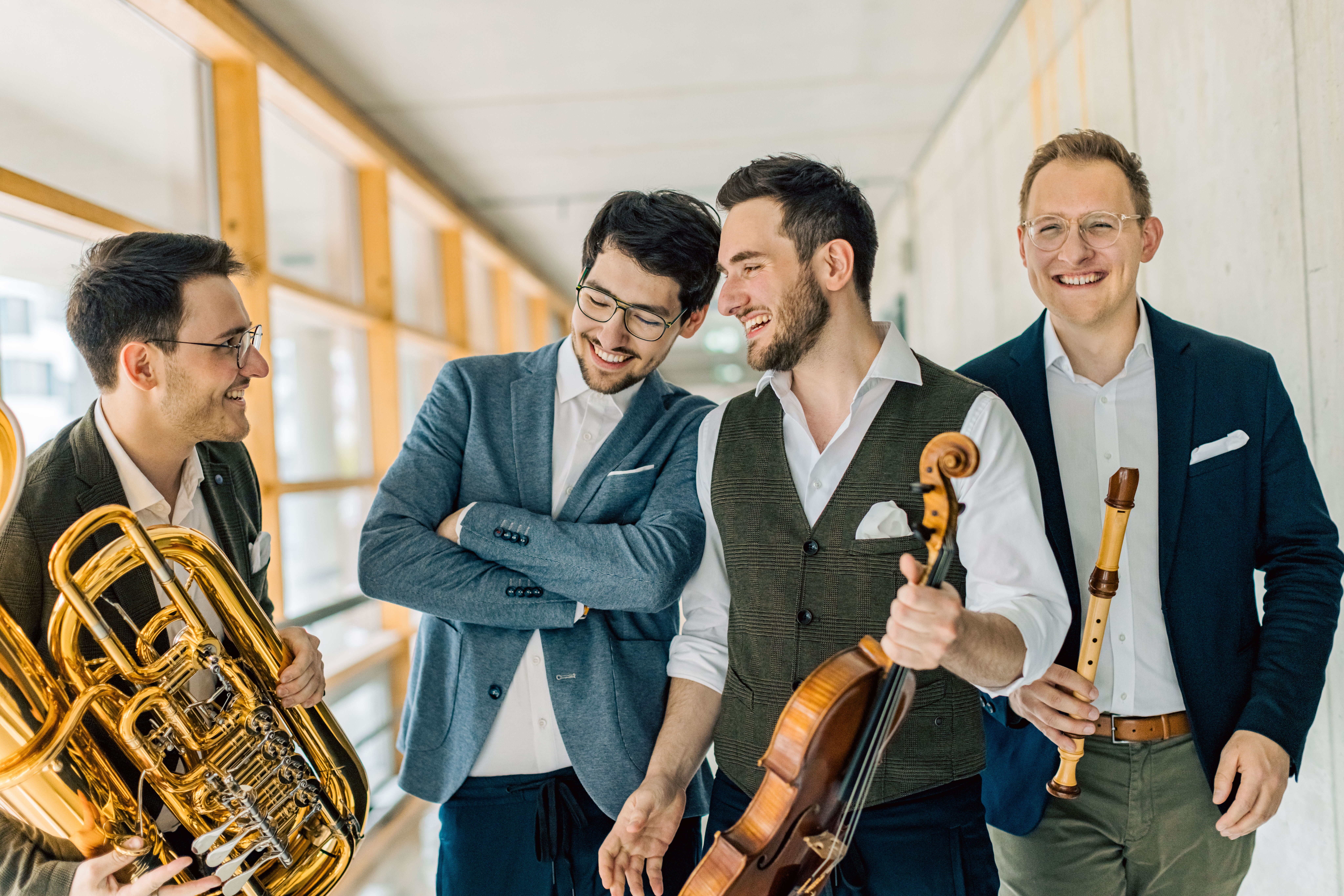 Was für eine Besetzung! Was für eine Energie! Was für eine Dynamik! Frech, witzig und virtuos brausen diese vier Brüder kreuz und quer durch die Musikgeschichte: David (Blockflöten), Lukas (Viola), Jonathan (Klavier & Melodika & Cajon) und Fabian (Tuba & Violine) haben sichtlich und hörbar Vergnügen an ihrem mitreißenden und packenden Tun. „Performance“ im besten Sinne.